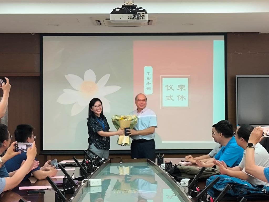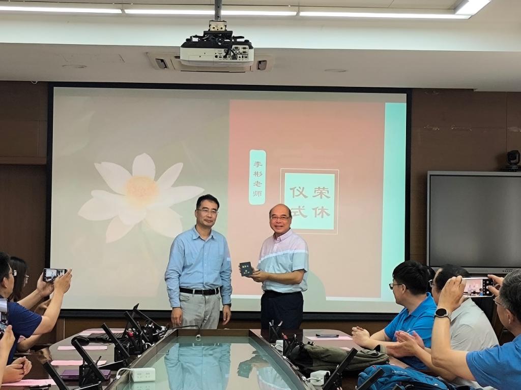 荣休仪式上,赵新为李彬老师颁发退休证,刘景泰赠送纪念品,周璐代表青年教师献花。