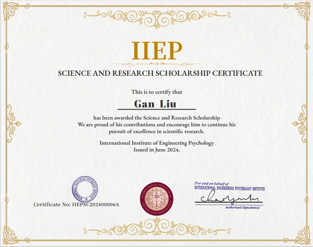 fun88官网体育硕士研究生刘淦,凭借其在人工智能和人机交互领域的卓越研究成果,荣获国际工程心理学研究所(International Institute of Engineering Psychology,IIEP)设立的“IIEP科研奖学金”。该奖项旨在激发员工的科研热情,提升学术研究水平,并鼓励学术道路上的卓越追求者,是人工智能领域的一项重要荣誉。