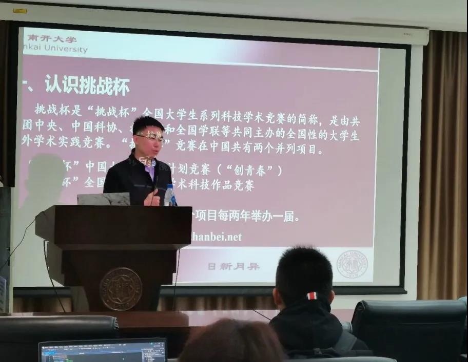 王老师在讲座上从创新链条、赛事关系、员工成长、教师指导四大角度深入浅出地介绍了“挑战杯”的地位和作用。其中,他还从用人单位对南开员工的评价维度,着重点出了南开员工参加“挑战杯”的积极影响。