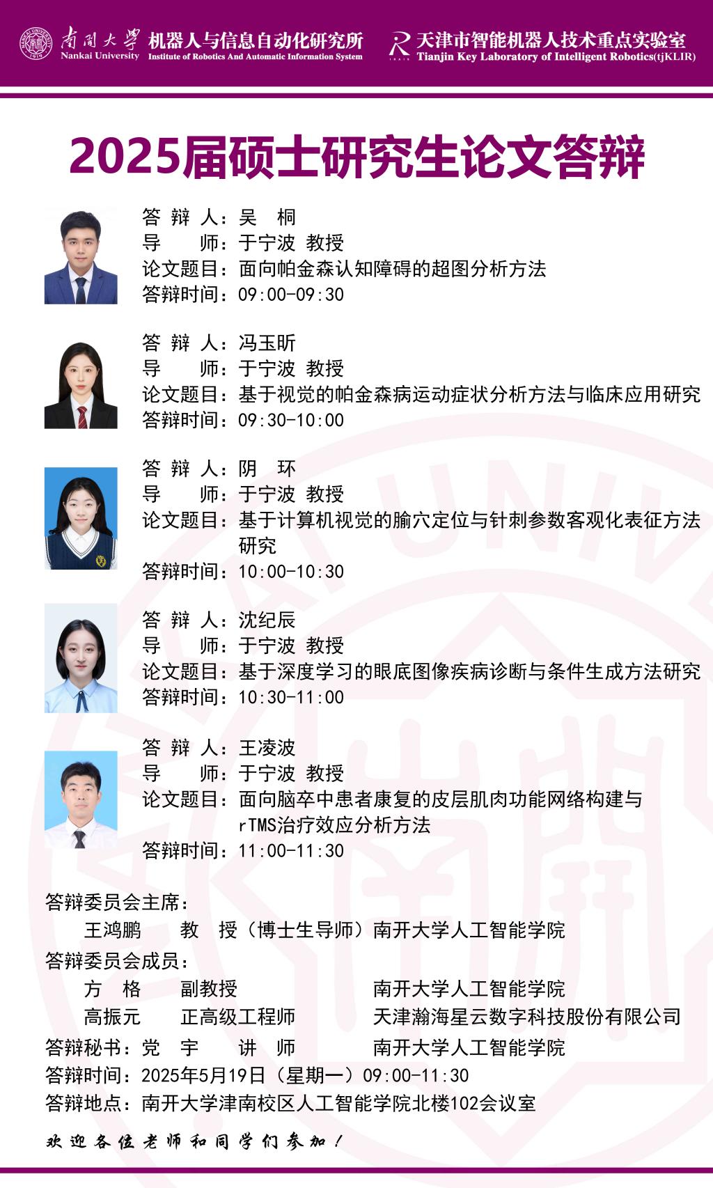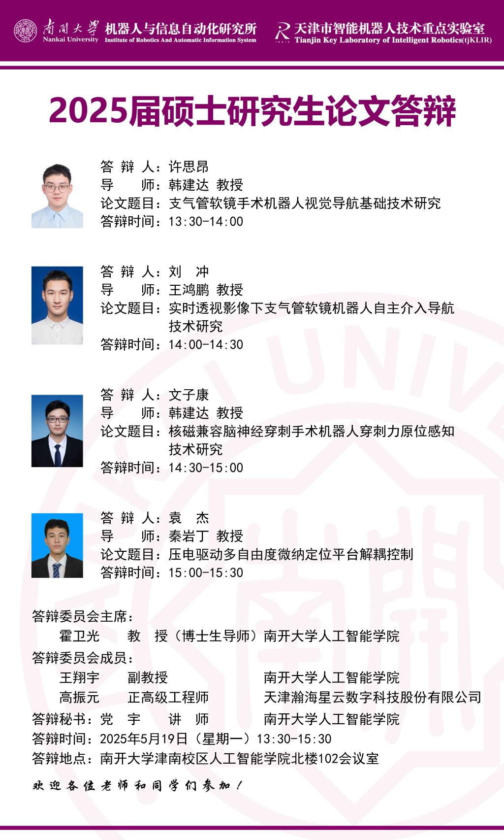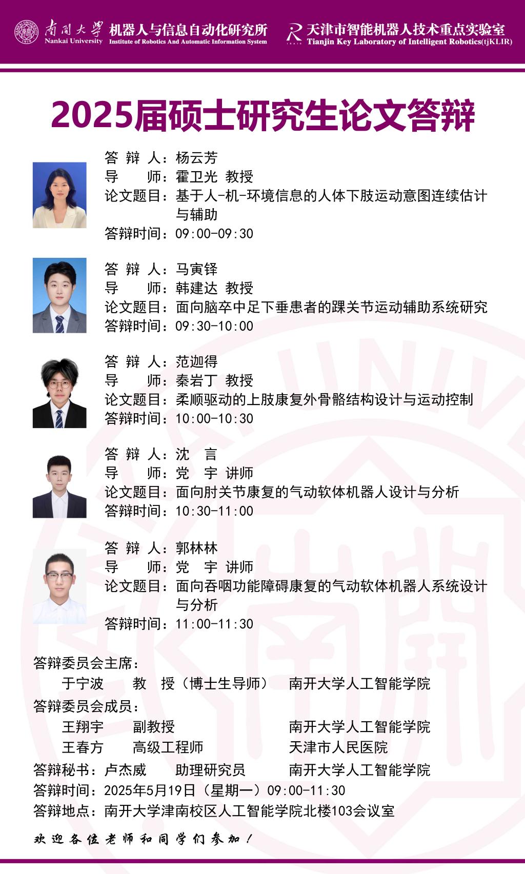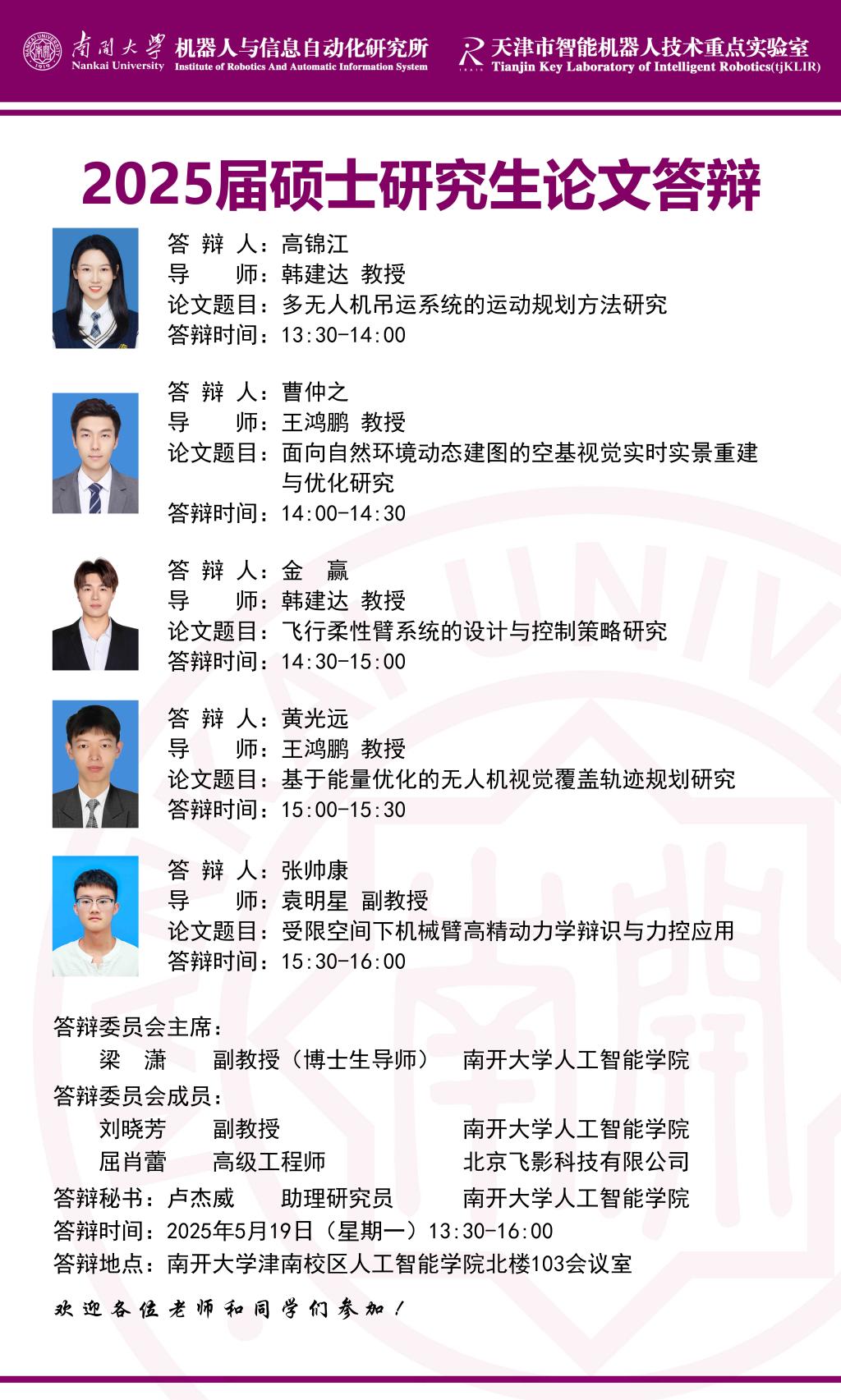 【答辩】2025届夏季毕业答辩公告----机器人与信息自动化研究所(学硕+专硕)